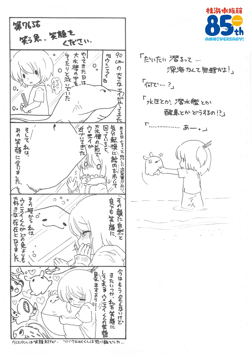 ウシエイくんは大水槽に住んでいた90cmの大きさがあった大きなエイで、もったいないおやじも人生で2、3回ほどしかあったことない大変珍しい種類との事。