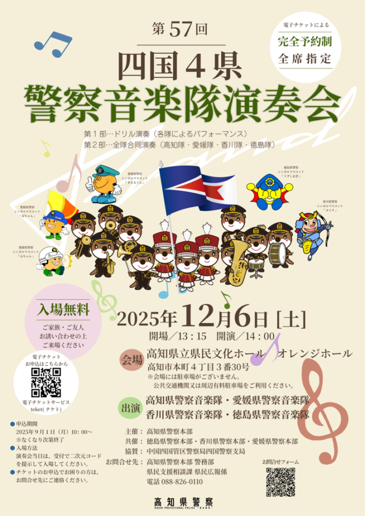 これまでにも、南警察署や県警本部とともに地域に密着した活動を積極的に行ってきたおとどちゃんですが、今度はなんと、高知県警より熱烈なオファーを受け、四国4県の警察音楽隊のよる演奏会に出演することが決定!