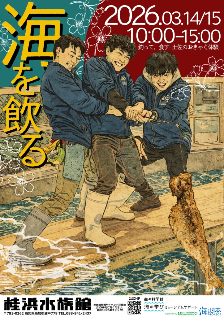 ニュース&トピックス バックナンバー一覧 再開!ヒョウゴベンダ★ペンギン団地 ペンギンごはん(エサやり体験) ハマスイといえば! 究極のエサやり体験ができる全国でもハマスイだけじゃないだろうか・・。 鳥インフルエンザにて、お休みしていたペンギンごはんですが 3月14日より再開いたします ペンギン団地もちょっと… 海を飲る~土佐のおきゃく体験~ 2026年3月14日(土)・15日(日) 10:00-15:00 「海を飲む~土佐のおきゃく体験~」を開催! ハマスイで釣りを体験しよう! 釣った魚のアジを食べることができるイベントです。 デジタル時… おらんくの池大清掃 実施! 2026年3月9日(月)~3月13日(金) 海水魚たちが暮らしている 「おらんくの池」大清掃を実施! 春寒も緩みはじめ、ようやく過ごしやすい気候となってまいりました。 遠足やデートなど、お出かけにちょ… 求む!経験者!! 2026年 春の経験者スタッフ募集 桂浜水族館 2026年 春の経験者スタッフ募集 2026年は丙午(ひのえうま)。 「火の年やき、もっと!もっと!!なんか変わらないかん!!」 そんな思いを胸に、桂浜水族館では新しい仲間を募集します。 … 本日のフードストア営業について 2026年3月4日(水)本日 急遽、食堂スタッフの「マダム」がプチ修行に出ることになったため フードストアの営業が15:00までとなりました。 突然のお知らせとなってしまい、ご来館の皆さまにはご迷惑を… 会える水族館リニューアルオープン 2026年3月5日(木) KAIKENの「会える水族館」がリニューアルオープンします!! 桂浜水族館は、創業85周年の折に本格化した企業改革を突き進める中で、「働くスタッフ」にスポットをあて、ファンの… コツメカワウソ「お龍」について 現在、「かわうその家」で生活しているコツメカワウソの「お龍」について、昨年の12月中旬頃から脱毛がありましたが、皆様に見守っていただきながら展示エリアにて療養生活をしておりました。 獣医に相談し、指導… 龍馬マラソンについてお知らせ 2026年2月15日(日) \「高知龍馬マラソン2026」開催/ 全国のランナーとファンが一堂に会するマラソンの祭典が今年も行われ、高知の冬が熱気に包まれます! フィニッシュ地点の春野陸上競技… 桂浜公園バリアフリー情報 高知も2月に入り、観光びらきとなりました まだまだ寒いのですが、高知の植物には芽が出て、 空や海、風などの自然は春の訪れが来ています 暖かくなると、おでかけもしなきゃ!! 桂浜水族館のある、桂浜公園の… アキラの部屋のアクティビティタイムについて 2026年2月7日(土)・8日(日)14:00start! アキラの部屋アクティビティタイムは 実習生の「ありちゃん」が担当! アキラの部屋で飼育展示している両生類や古代魚の中から 実習中にありちゃん… イベントカレンダー