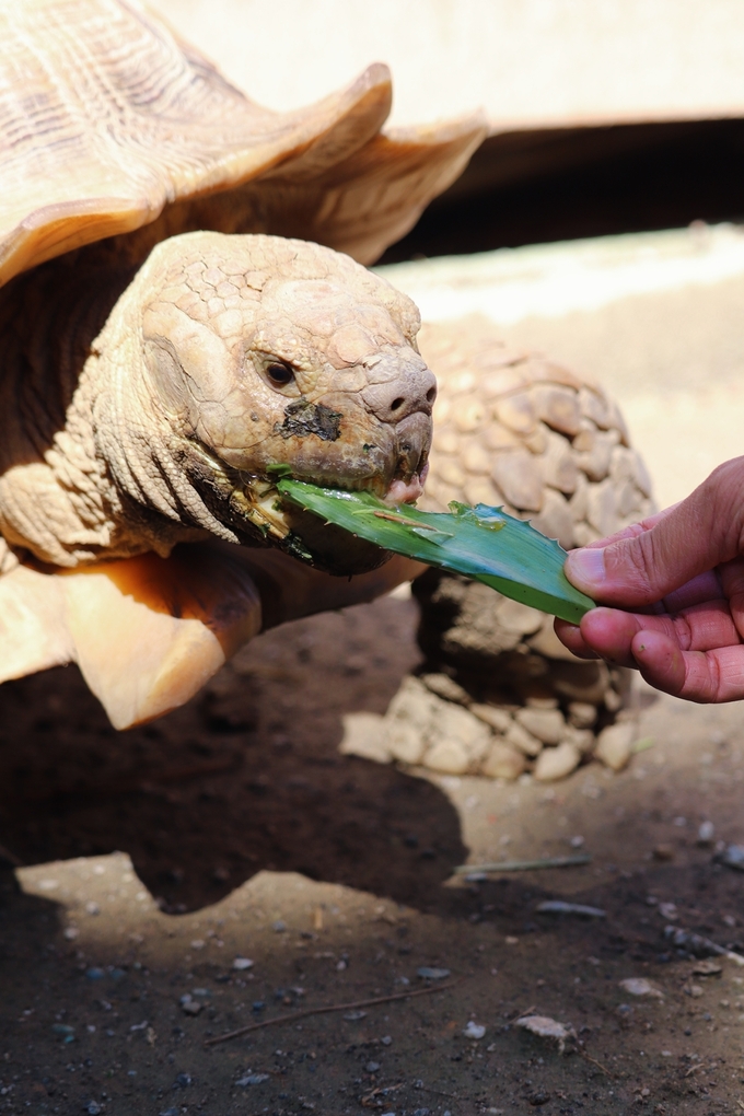 85周年を記念して姉妹提携をした神戸市立須磨海浜水族園よりやってきたケヅメリクガメ。ダイちゃんとロクちゃんにえさを与えることが出来ます。