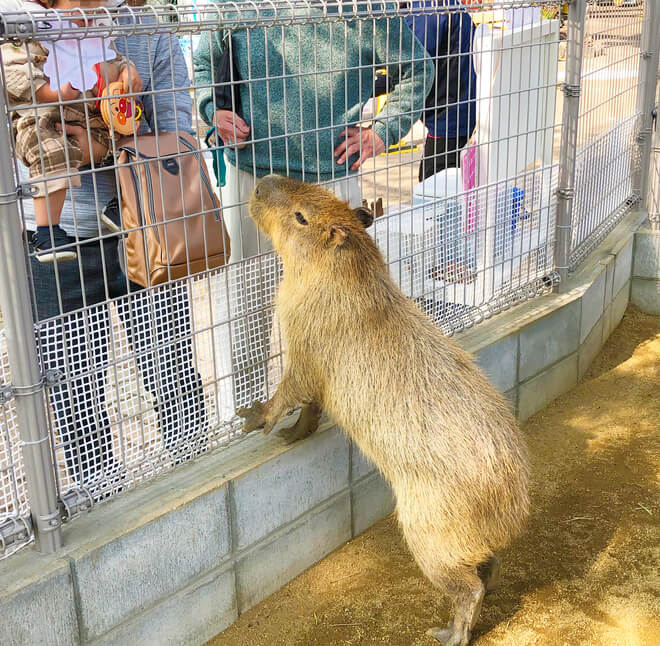 注意:当館のカピバラはトレーニングをしているため手渡しでエサを上手に食べることが出来ます。
